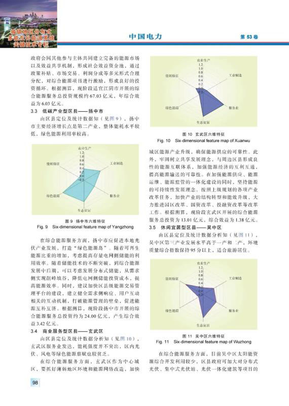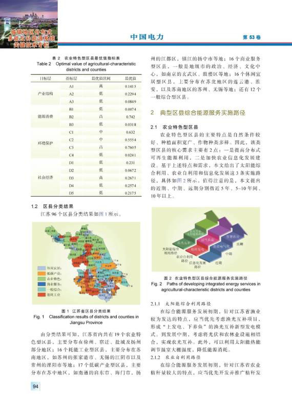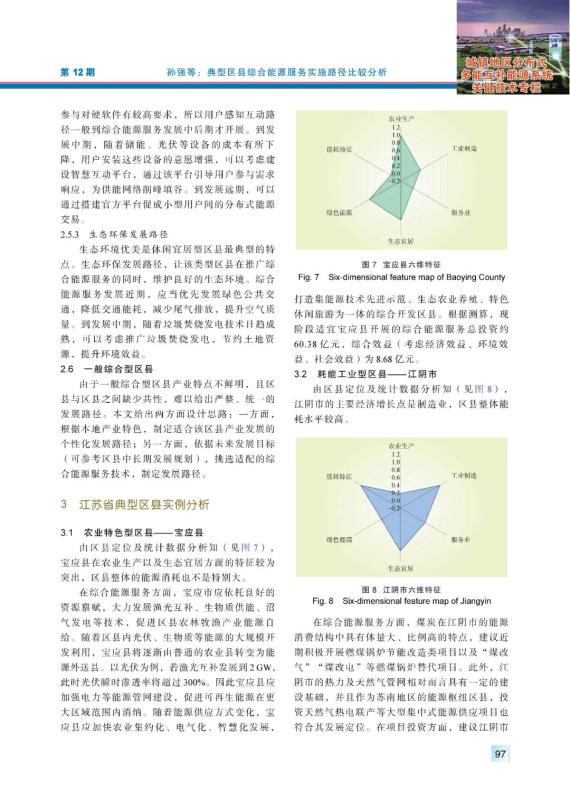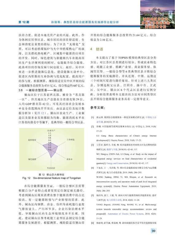 結(jié)論:本文提出了基于TOPSIS模型的典型區(qū)縣分類方法,對江蘇區(qū)縣類別進行劃分,形成農(nóng)業(yè)特色型、耗能工業(yè)型、低碳產(chǎn)業(yè)型、商業(yè)服務(wù)型、休閑宜居型、一般綜合型等6類典型區(qū)縣開展綜合能源服務(wù)的實施路徑,并從近期、中期、遠期這三個時間尺度進行路徑布局。針對上述六大類區(qū)縣,分別選取寶應(yīng)縣、江陰市、揚中市、玄武區(qū)、吳中區(qū)、銅山區(qū)6個代表區(qū)縣進行實例分析,分析結(jié)果表明本文提出的方法對不同類型區(qū)縣開展綜合能源服務(wù)業(yè)務(wù)具有一定指導(dǎo)意義。