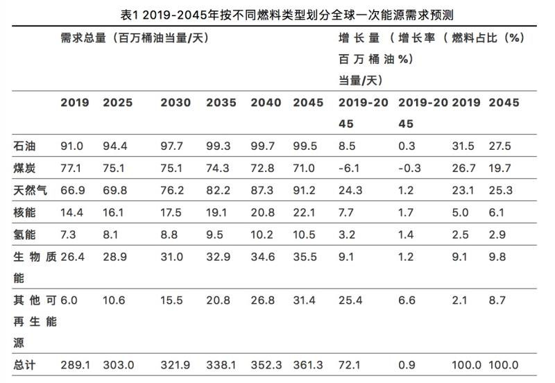 ?石油仍將在全球能源結(jié)構(gòu)中占據(jù)最大比例。如果新冠疫情在明年基本得到控制,全球石油需求預計在2021年部分恢復,到2025年將達到9440萬桶/天,并在2045年達到9950萬桶/天。2019年,石油占全球能源需求的31%以上,預計到2045年將降至27%,但仍是最大的能源來源,其次是天然氣(約25%)和煤炭(近20%),如表1所示。
