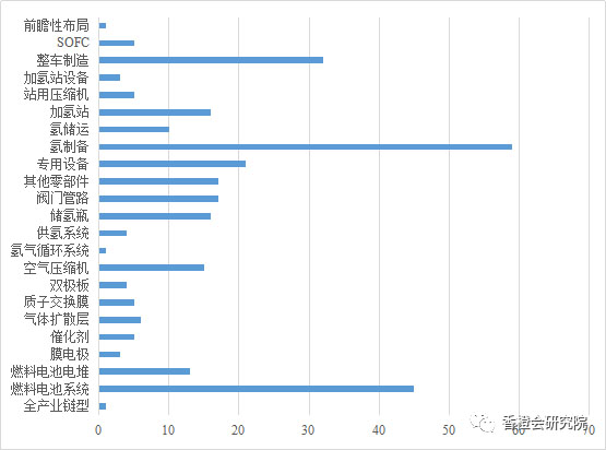 氫制備以59家位居第一;緊隨其后的是燃料電池系統(tǒng),共45家;排在第三位的是整車制造,涉及企業(yè)共32家。