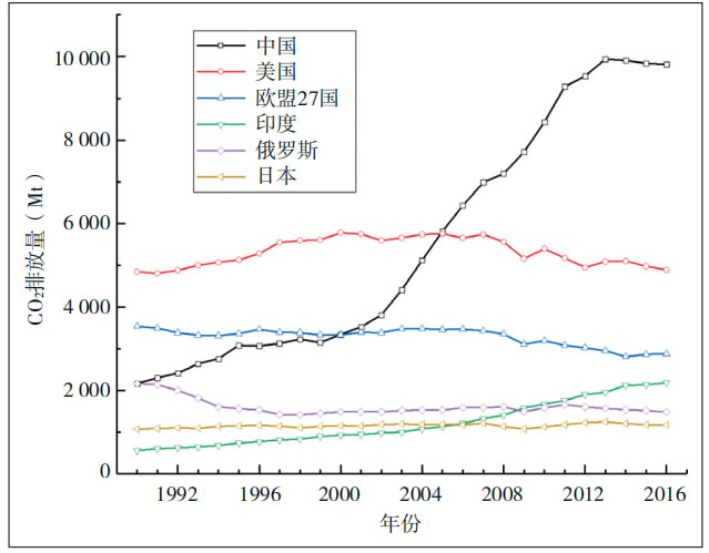圖1 典型國家/地區(qū)的CO2排放量