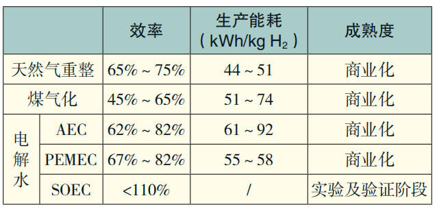 現(xiàn)階段全球氫氣生產(chǎn)幾乎全部來自化石能源,其 中48%來自天然氣重整,30%來自油部分氧化,18%來自煤氣化,僅4%來自電解水,而高溫蒸汽電解、人工光合作用、生物制氫等新興工藝均處于早期發(fā)展階段。各類制氫技術(shù)的基本參數(shù)見表1。成本上,目前天然氣重整方式最低,在美國大型天然氣重整制氫成本為0.05歐元/kWh(2歐元/kg H2)。電解制氫成本非常高,倫敦某加氫站氫氣成本為0.25歐元/kWh(10歐元/ kg H2)。