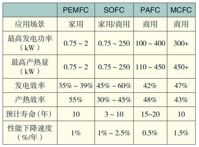 氫能用于建筑供熱的方式包括氫氣鍋爐和FC熱電聯(lián)供(fuel cell-combined heat and power,F(xiàn)CCHP)系統(tǒng)等?,F(xiàn)有燃?xì)忮仩t只允許摻混少量氫氣,若使用純氫作為燃料,需對裝置結(jié)構(gòu)進(jìn)行大規(guī)模改造。FC-CHP系統(tǒng)噪音小、排放少、效率高,是唯一超過全電系統(tǒng)運(yùn)行效率的CHP系統(tǒng),并且由于其 電熱比很高,非常適用于熱負(fù)荷低的建筑。各類FCCHP性能參數(shù)見表2,其中,質(zhì)子交換膜燃料電池 (proton exchange membrane fuel cells,PEMFCs)主要 用于民用供暖系統(tǒng),磷酸燃料電池(phosphoric acid fuel cells,PAFCs)和熔融碳酸鹽燃料電池(molten carbonate fuel cells,MCFCs)主要用于大型商用供暖系統(tǒng),固體氧化物燃料電池(solid oxide fuel cells,SOFCs)在民用和商用系統(tǒng)中均可使用。目前FCCHP價格較高,每kW發(fā)電量價格在1萬美元左右,但在過去10年內(nèi),價格已降低了一半左右,且使用壽命也有所增加,預(yù)計在2025年~2050年價格降至與其他 供熱系統(tǒng)相近水平。