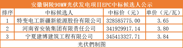 中國儲能網(wǎng)訊:12月25日,安徽省銅陵郊區(qū)銅山鎮(zhèn)90MW光伏發(fā)電項目EPC總承包工程中標候選人公示,其中特變電工新疆新能源股份有限公司以中標價328585775元,單價3.65元/瓦,成為第一中標候選人。具體中標詳情如下:
