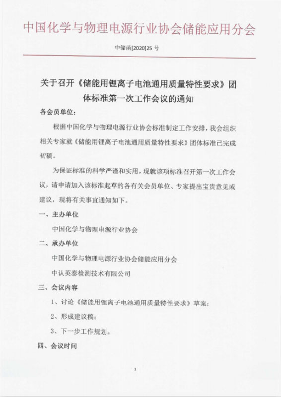 關(guān)于召開《儲能用鋰離子電池通用質(zhì)量特性要求》團體標(biāo)準(zhǔn)第一次工作會議的通知