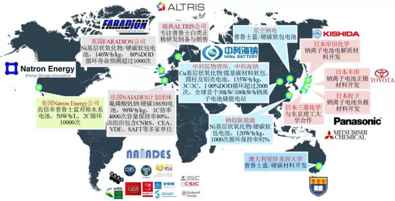 2010年以來(lái),鈉離子電池受到國(guó)內(nèi)外學(xué)術(shù)界和產(chǎn)業(yè)界的廣泛關(guān)注。目前,鈉離子電池已逐步開始了從實(shí)驗(yàn)室走向?qū)嵱没瘧?yīng)用的階段,國(guó)內(nèi)外已有超過二十家企業(yè)正在進(jìn)行鈉離子電池產(chǎn)業(yè)化的相關(guān)布局,并取得了重要進(jìn)展,主要包括英國(guó)FARADION公司、法國(guó)NAIADES計(jì)劃團(tuán)體、美國(guó)Natron Energy公司、日本岸田化學(xué)、豐田、松下、三菱化學(xué),以及我國(guó)的北京中科海鈉科技有限公司、浙江鈉創(chuàng)新能源有限公司、遼寧星空鈉電電池有限公司等(圖4)。不同企業(yè)所采用電化學(xué)體系各有不同,其中正極材料體系主要包括層狀氧化物(如銅鐵錳和鎳鐵錳三元材料)、聚陰離子型化合物(如氟磷酸釩鈉)和普魯士藍(lán)類等,負(fù)極材料體系主要包括軟碳、硬碳以及軟硬復(fù)合無(wú)定形碳等。