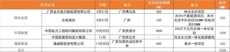 另外,除廣西能源局核定的平價(jià)項(xiàng)目外,國家電投、中能建以及通威集團(tuán)在廣西省也陸續(xù)完成2.45GW光伏項(xiàng)目的備案或簽約,具體見下: