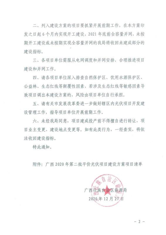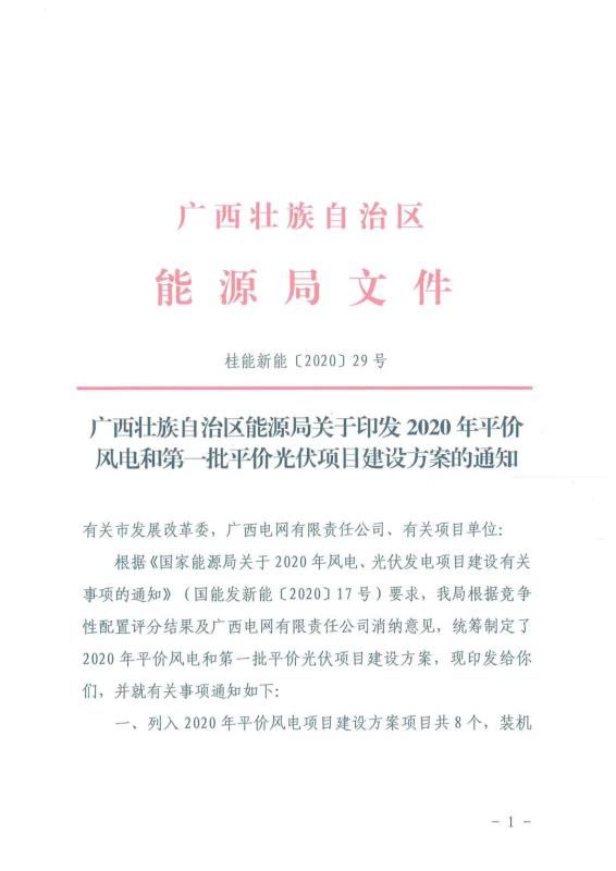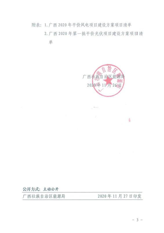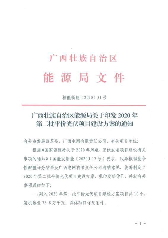 中國儲能網(wǎng)訊:2020年12月28日,廣西壯族自治區(qū)能源局印發(fā)《2020年第二批平價(jià)光伏項(xiàng)目建設(shè)方案的通知》。