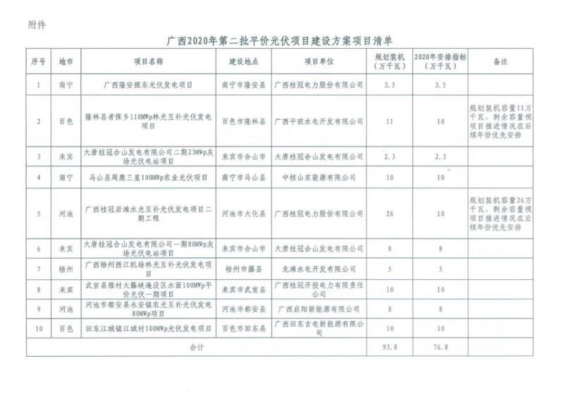 通知表明,廣西能源局根據(jù)競爭性配置評分結(jié)果及廣西電網(wǎng)有限責(zé)任公司消納意見,統(tǒng)籌制定了2020年第二批平價(jià)光伏項(xiàng)目建設(shè)方案,共計(jì)項(xiàng)目10個,規(guī)模為76.8萬千瓦。