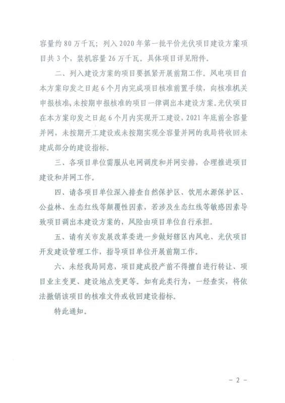 通知要求,列入建設(shè)方案的項(xiàng)目要抓緊開展前期工作,在本方案印發(fā)之日起6個月內(nèi)實(shí)現(xiàn)開工建設(shè),2021年底前全容量并網(wǎng),未按期開工建設(shè)或未按期實(shí)現(xiàn)全容量并網(wǎng)的我局將收回未建成部分的建設(shè)指標(biāo)。