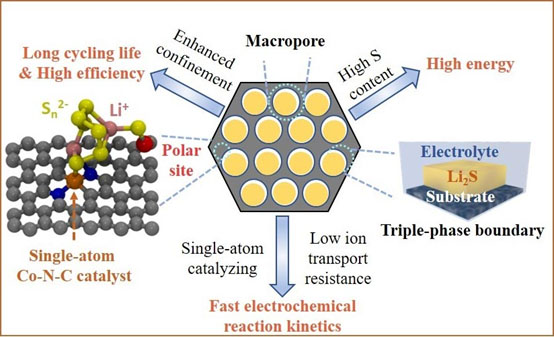 為了解決上述問(wèn)題,Zhao教授團(tuán)隊(duì)與國(guó)際研究人員合作,提出了一種陰極設(shè)計(jì)概念,可以實(shí)現(xiàn)良好的鋰硫電池性能。研究人員將硫均勻地嵌入到高度定向的大孔中,同時(shí)該大孔內(nèi)部嵌有豐富分活性位點(diǎn),以緊緊地吸附多硫化物,消除穿梭效應(yīng)以及鋰金屬腐蝕影響。通過(guò)為鋰硫電池提出新型硫陰極設(shè)計(jì)原則,該聯(lián)合小組提升了該電池的能量密度,并為實(shí)現(xiàn)該電池的工業(yè)化邁進(jìn)了一大步。