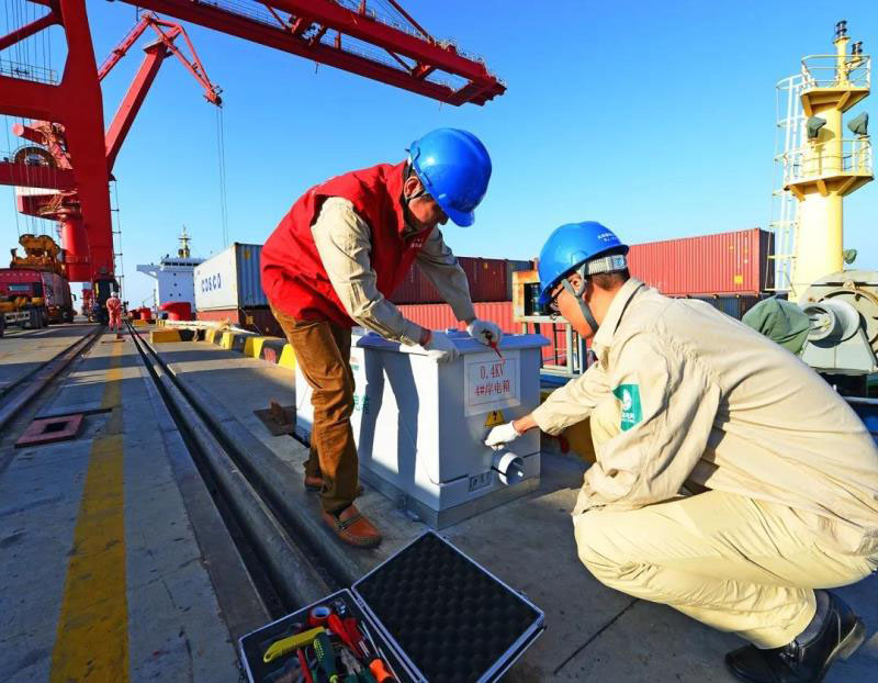 ▲國網江蘇鹽城供電公司技術人員在大豐港一期碼頭協(xié)助船舶安裝岸電裝置