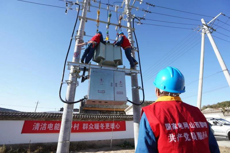 ▲國網山西電力員工在“煤改電”施工現(xiàn)場安裝變壓器
