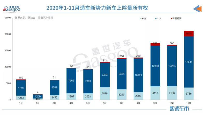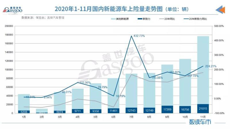 值得一提的是,造車新勢力企業(yè)2020年11月上險量首次突破兩萬輛,達到21,015輛,較去年同期增長224.21%,增幅高于整體新能源市場。2020年1-11月,造車新勢力累計上險量為12.5萬輛,同比上漲117.77%,占整體新能源市場銷量比重的13.86%。