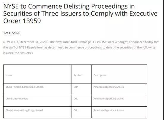 當(dāng)?shù)貢r(shí)間2020年12月31日,紐交所宣布,將對(duì)中國(guó)移動(dòng)有限公司、中國(guó)電信股份有限公司、中國(guó)聯(lián)通(香港)有限公司進(jìn)行退市處理,三家公司將在1月7日至1月11日期間退市。此事的背景源自于去年11月特朗普政府宣布的一項(xiàng)行政命令。