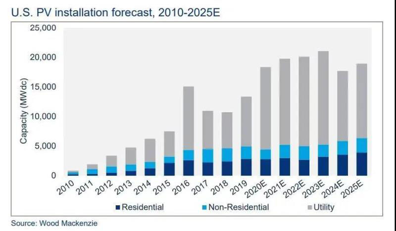 圖片:2021年美國新增光伏裝機將首次突破20GW。來源:Wood Mackenzie