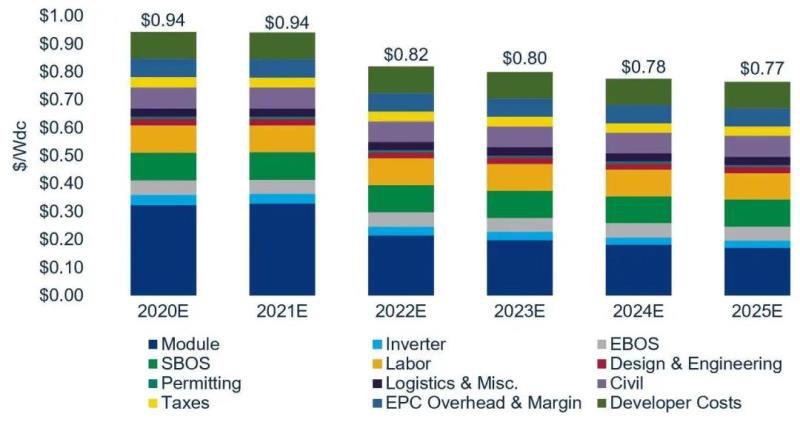 此外,從2019年到2020年,由于光伏組件價格持續(xù)壓低系統(tǒng)成本,光伏系統(tǒng)的所有細分市場的成本都有所下降。雖然2020年下半年玻璃等輔材漲價導致組件價格上漲,但是總趨勢還是同比下降的。根據(jù)Wood Mackenzie最近發(fā)布的《美國太陽能光伏系統(tǒng)價格報告》,2020年100 MW公用設(shè)施規(guī)模的光伏系統(tǒng)平均成本為0.94美元/W,到2025年可能下降19%(所有數(shù)據(jù)均為直流側(cè))。尤其是2021至2022年,單瓦成本將下降13%。主要原因在于201關(guān)稅將逐步取消。