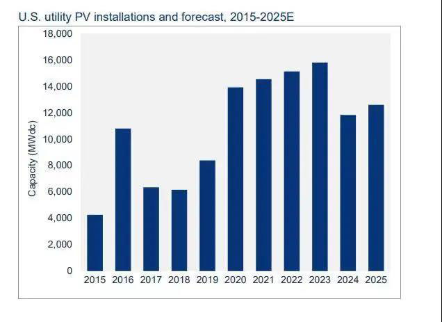 圖片:2020年美國公共事業(yè)規(guī)模光伏裝機容量在14GW左右。來源:Wood Mackenzie