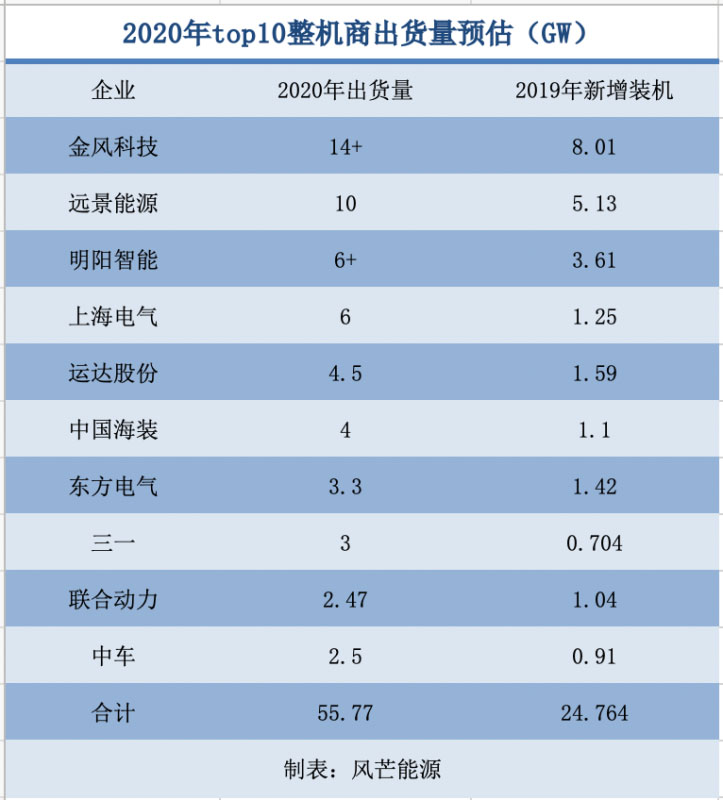根據(jù)風(fēng)芒能源問詢、統(tǒng)計以及預(yù)估,2020年全年,排名前十的整機商出貨量將超過50GW左右。相較于光伏行業(yè)動態(tài)變化的集中趨勢,風(fēng)電整機商的排名及市占率基本保持穩(wěn)定。其中,TOP3的整機商金風(fēng)科技、遠(yuǎn)景能源、明陽智能累計出貨量超過30GW,三家市場占比最終預(yù)計在60%左右,與2019年的62.6%比,雖受搶裝影響,三家市占率稍有減弱,但行業(yè)集中度基本未受影響。