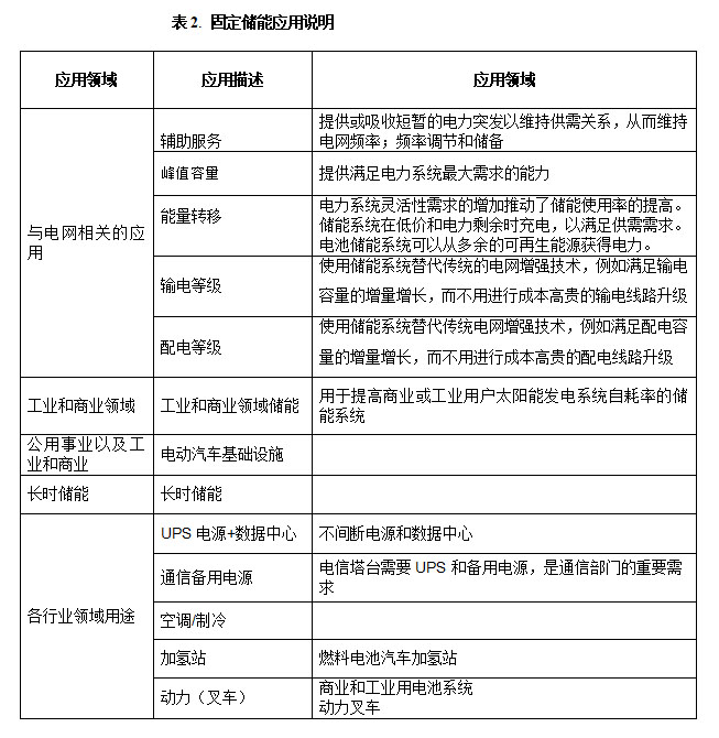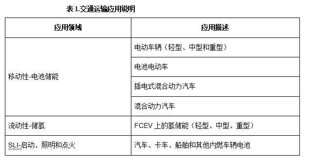 本報告涵蓋的兩個主要市場是固定儲能市場和義能運輸市場,每個市場又細分為各自的領(lǐng)域。 運輸有兩個主要領(lǐng)域:電動汽車(xEV)或燃料電池電動汽車(FCEV)的機動性,以及燃油汽車起動、照明和點火(SLI)。 表1中進一步描述了與每個部門相關(guān)的應用。表2中描述了固定儲能市場,其中大部分與電網(wǎng)和商業(yè)彈性相關(guān)。