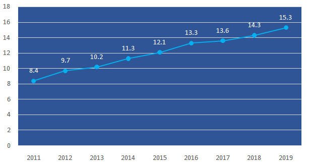 注:2015年[ ]內(nèi)為五年累計(jì)值,2019年[ ]為四年累計(jì)值。