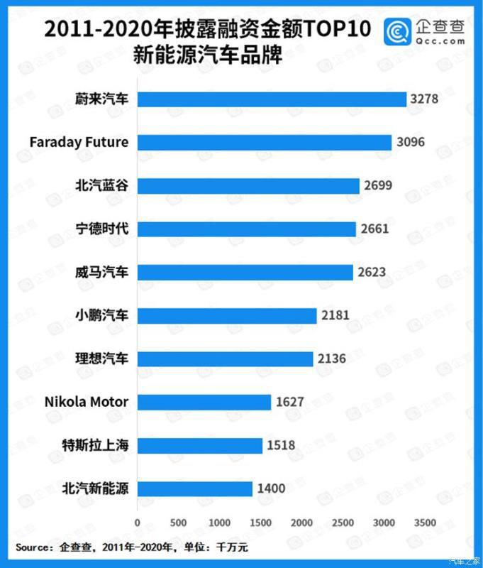 從新能源汽車品牌的融資總金額來看,蔚來汽車以327.8億元摘得魁首,F(xiàn)araday Future(法拉第未來)以309.6億元位居第二,北汽藍谷以269.9億元位居第三。此外,入圍融資金額TOP10的新能源汽車相關品牌還有寧德時代、威馬汽車、小鵬汽車、理想汽車等。