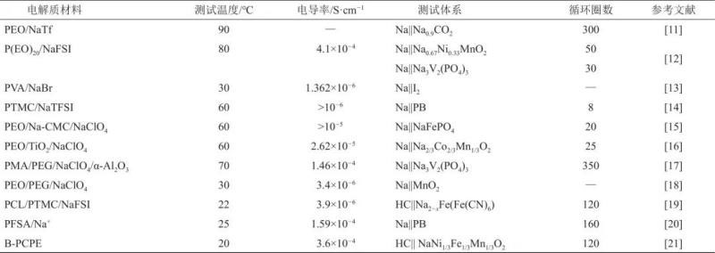 表1對比了報道的聚合物固態(tài)電解質(zhì)的不同測試溫度、電導(dǎo)率、循環(huán)圈數(shù)數(shù)據(jù)。由于聚合物固態(tài)電解質(zhì)在電池循環(huán)中存在復(fù)雜的界面演變機制,因此將電池的工作圈數(shù)納入考慮的重要指標(biāo)。可以看出隨著研究的開展,較為成熟的鈉離子電池正負極與聚合物固態(tài)電解質(zhì)的搭配體現(xiàn)出一定的應(yīng)用潛力。同時,通過改變鹽濃度、摻雜分子量較小的低聚物等方法發(fā)展具有更低的玻璃化溫度的聚合物電解質(zhì),通過分子設(shè)計改變離子在聚合物框架中的傳輸機制等方式,研究者正在實現(xiàn)裝配的全固態(tài)鈉離子電池從中溫90 ℃逐步向室溫甚至零下低溫環(huán)境中的應(yīng)用發(fā)展。