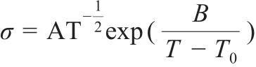 向聚合物固態(tài)電解質(zhì)中引入溶劑分子為離子提供強的分子極化作用,形成聚合物凝膠電解質(zhì),有效地提高了其離子電導(dǎo)率。Hashmi等使用離子液體EMITf浸潤含有0.5 mol/L NaCF3SO3(NaTf)的聚(偏二氟乙烯-co-六氟丙烯)(PVDF-HFP)制備凝膠電解質(zhì),發(fā)現(xiàn)室溫電導(dǎo)率高達5.74×10-3 S/cm?;谑?2)所描述的玻璃化溫度附近的Vogel-Tammann-Fulcher模型研究了聚合物的自由體積對帶電離子輸運的動力學(xué)過程影響。采用了基于交流-直流技術(shù)的Evans方法[9],通過式(3)