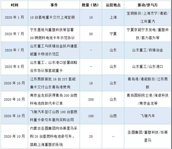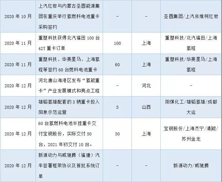 2020年國(guó)內(nèi)部分氫燃料電池重卡運(yùn)營(yíng)和訂單情況