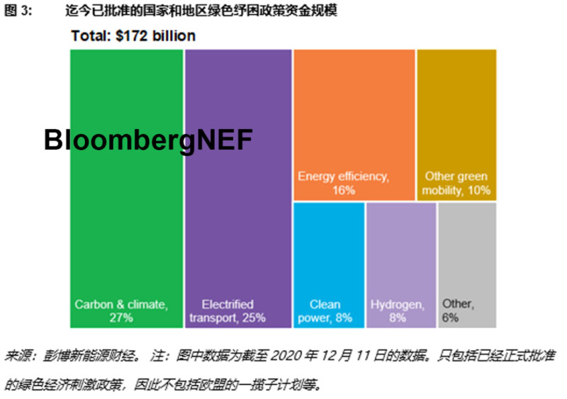 第三,疫情早期 "更好地重建 "(build back better)的呼聲所需的建設(shè)資金逐步落實(shí)。彭博新能源財(cái)經(jīng)"綠色政策追蹤"系列報(bào)告發(fā)現(xiàn),迄今為止,國(guó)家和地方政府"綠色"紓困資金撥付規(guī)模達(dá)1720億美元,重點(diǎn)扶持交通電動(dòng)化、清潔化轉(zhuǎn)型;能效提升;清潔電力和氫能等領(lǐng)域。今年的撥款規(guī)模與十年前全球金融危機(jī)后的綠色紓困政策承諾的撥款規(guī)模相近,而當(dāng)時(shí)這部分資金在培育清潔能源產(chǎn)業(yè)和吸引私人投資方面發(fā)揮了重要作用。今年危機(jī)再臨,部分大國(guó)推出綠色紓困計(jì)劃。到目前為止,絕大部分資金來(lái)自綠色經(jīng)濟(jì)刺激獲批的歐洲國(guó)家和韓國(guó),日本也將迎頭趕上;美國(guó)和澳大利亞仍無(wú)實(shí)際舉動(dòng)。歐盟經(jīng)濟(jì)復(fù)蘇計(jì)劃預(yù)計(jì)近期就能通過(guò),清潔能源領(lǐng)域投資將再添6000億美元。