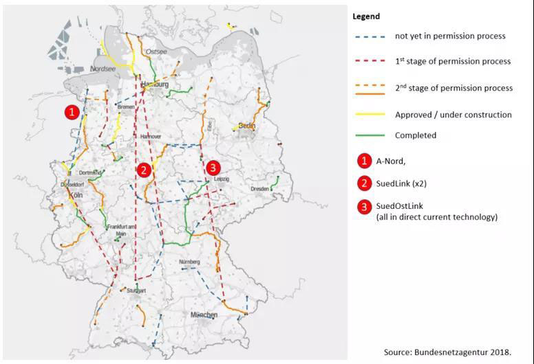 對(duì)此,德國(guó)政府和電網(wǎng)運(yùn)營(yíng)商已經(jīng)開(kāi)始加快建設(shè)更多的南北輸電線(xiàn),見(jiàn)上圖。根據(jù)聯(lián)邦網(wǎng)絡(luò)局的數(shù)據(jù),2025年之前,預(yù)計(jì)將有4650公里的新電線(xiàn)建成,另有約3050公里的電力線(xiàn)被翻新。雖然鋪設(shè)新線(xiàn)路涉及到土地,居民等方方面面的協(xié)調(diào)管理,但若不加快輸電線(xiàn)的建設(shè)以減少南北能源消費(fèi)和生產(chǎn)的不平衡情況,這一問(wèn)題可能會(huì)成為德國(guó)當(dāng)前目標(biāo)達(dá)成的向100%可再生能源發(fā)電的最大阻礙因素。