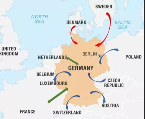 在地圖上顯示各國(guó)與德國(guó)的進(jìn)出口關(guān)系如下。