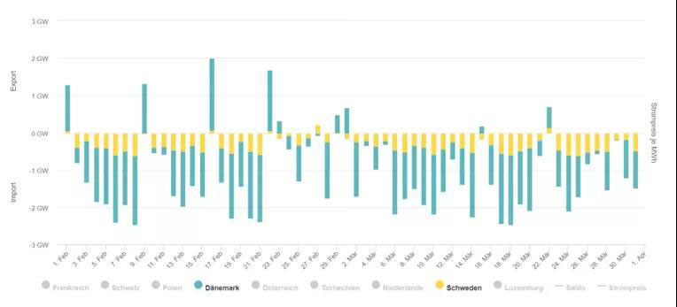 基于2月的出口數(shù)據(jù),接下來(lái)我們來(lái)看一看德國(guó)主要的電力進(jìn)出口國(guó)家分別有哪些。以下數(shù)據(jù)均取自Agora數(shù)據(jù)平臺(tái)。