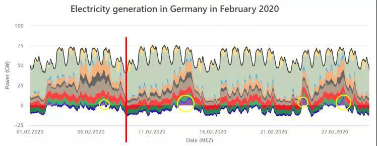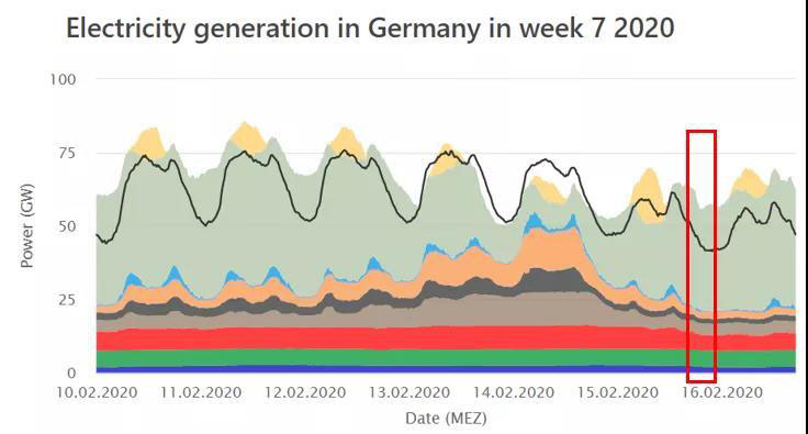 以2020年2月10~16日的一周為例,該時(shí)段內(nèi)德國(guó)風(fēng)電產(chǎn)量非常高,峰值可達(dá)45.48GW。因此,燃?xì)獍l(fā)電,燃煤發(fā)電,甚至核電都在相應(yīng)調(diào)節(jié)出力。例如,2月16日周日午間13:00,德國(guó)總電力負(fù)荷量為54.38GW,相對(duì)工作日同一時(shí)間的負(fù)荷較少。由于正值正午,光電出力為8.59GW,而風(fēng)力發(fā)電則達(dá)到了39.63GW。為消納這部分可再生能源發(fā)電,燃?xì)怆姀S在該時(shí)段壓至當(dāng)周最高出力的15.4%,硬煤電廠和褐煤電廠則分別壓至當(dāng)周最高出力的19.5%和35.4%。核電廠相對(duì)本周最高出力也減少了約35%。