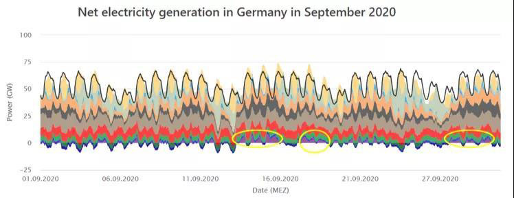 以0GW為界,圖中低于0GW的發(fā)電量均為出口,而高于0GW的淺紫色色塊(如黃圈中標(biāo)出的部分)則為凈電力進(jìn)口??梢钥闯?,9月風(fēng)光資源一般的情況下電力出口量并不高,最高電力進(jìn)口量也不超過(guò)10GW。