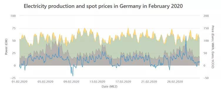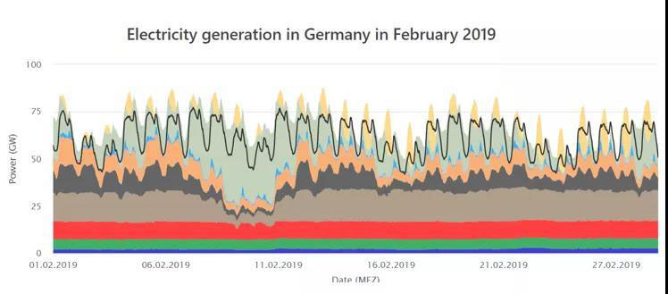 二月光照依然不充沛,但風(fēng)力發(fā)電量卻顯著上升,在2月22日達(dá)到了峰值46.88GW的發(fā)電量。2月1號(hào)是周六,因此第一天的負(fù)荷量就相對(duì)較低。整體看來(lái),工作日與周末的總負(fù)荷明顯不同,這樣的需求側(cè)與電源側(cè)均為高波動(dòng)性情況下,德國(guó)高比例新能源電力系統(tǒng)如何打破能源不可能三角,長(zhǎng)期維持電網(wǎng)安全穩(wěn)定運(yùn)行、高可靠性和低棄電率,值得深度分析研究。