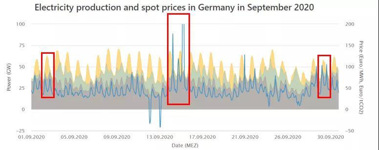 圖中的藍(lán)色曲線(xiàn)代表每日的電價(jià)(右y軸),黃色和綠色色塊分別代表光伏、風(fēng)電出力,淺棕色色塊則是化石能源與核能(以下統(tǒng)稱(chēng)常規(guī)能源)的發(fā)電量??梢钥闯觯旁码m然風(fēng)電出力較小,但光照資源較為優(yōu)越,因此電價(jià)曲線(xiàn)在一天內(nèi)有非常明顯的峰谷差,最高位和最低位現(xiàn)貨市場(chǎng)出清價(jià)格平均相差約20~30歐元/MWh–正午光電出力最高時(shí)電價(jià)非常低,早晚風(fēng)光發(fā)電都較弱時(shí)電價(jià)又會(huì)暴漲。燃煤、燃?xì)鈾C(jī)組的出力曲線(xiàn)因此與電價(jià)曲線(xiàn)的形狀十分相似,且能看出電價(jià)曲線(xiàn)一般會(huì)略先于基礎(chǔ)能源發(fā)電曲線(xiàn),說(shuō)明現(xiàn)貨市場(chǎng)的價(jià)格變化有效激勵(lì)了這些常規(guī)電源的靈活出力和調(diào)峰。9月12~13日的周末,由于整體負(fù)荷較低,光伏出力又比較高,現(xiàn)貨市場(chǎng)甚至還出現(xiàn)了負(fù)電價(jià)。這是可再生能源大發(fā)情況下常出現(xiàn)的一種現(xiàn)象,意味著當(dāng)常規(guī)電源壓至最低出力仍不能消納所有可再生能源發(fā)電后,電力公司會(huì)向用戶(hù)支付一定的費(fèi)用讓他們開(kāi)啟家中的電力設(shè)備以消耗多余的發(fā)電,以避免導(dǎo)致電網(wǎng)阻塞和重載超載現(xiàn)象發(fā)生。