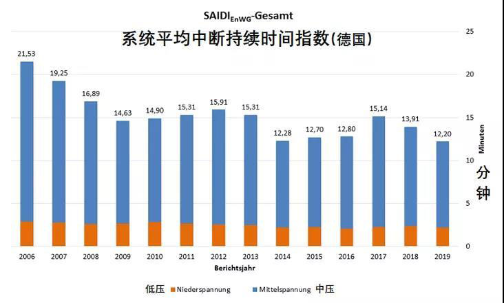 盡管較低的年均停電時(shí)間已經(jīng)驗(yàn)證了德國(guó)電網(wǎng)的相對(duì)穩(wěn)定和可靠性,聯(lián)邦網(wǎng)絡(luò)局仍稱(chēng)目前德國(guó)的停電現(xiàn)象更多是由極端天氣引起的,認(rèn)為間歇性的可再生能源的過(guò)渡對(duì)電力供應(yīng)質(zhì)量并沒(méi)有較大的負(fù)面影響,供電可靠性與綜合電壓合格率持續(xù)處于高位。該機(jī)構(gòu)的一個(gè)新聞稿中稱(chēng),自2006年開(kāi)始對(duì)電力系統(tǒng)進(jìn)行監(jiān)控以來(lái),德國(guó)年度可再生能源電力生產(chǎn)量占總電力負(fù)荷的份額從11.8%上升至2019年的42.4%,2019年風(fēng)光出力最高時(shí)候的發(fā)電占比高達(dá)83.6%,但平均停電時(shí)間仍呈逐年減少趨勢(shì)。2017年雖中斷時(shí)間有所提高,但主要是因?yàn)轱Z風(fēng),洪水和降雪等極端天氣事件所導(dǎo)致。
