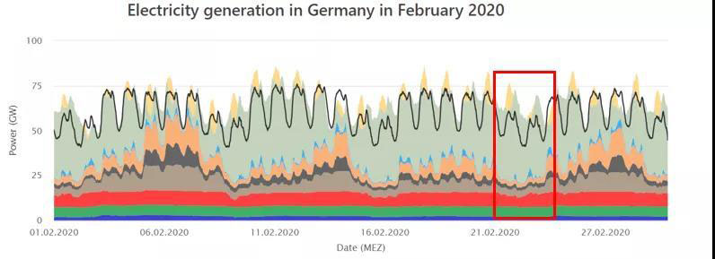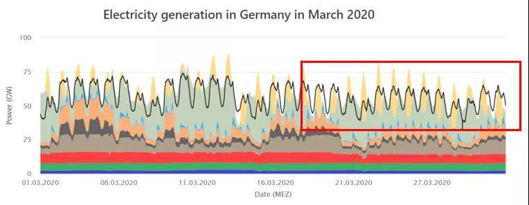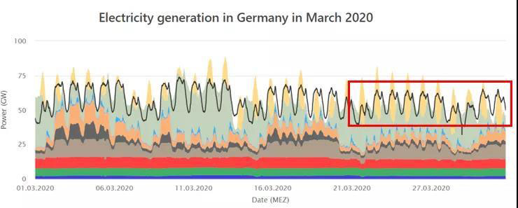 德國(guó)能源和水行業(yè)協(xié)會(huì)(BDEW)和巴登-符騰堡州太陽(yáng)能與氫能研究中心都對(duì)德國(guó)第一季度的可再生能源發(fā)電占比進(jìn)行了測(cè)算,均認(rèn)同二、三月天晴風(fēng)大的氣候因素和疫情導(dǎo)致的用電需求下降使得可再生能源發(fā)電占比快速增加。根據(jù)BDEW的測(cè)算結(jié)果,德國(guó)在2020年第一季度的總用電量(與2019年同期)下降2%,而總發(fā)電量卻同比下降了近7%。這其中核能和化石燃料發(fā)電減少了15%,風(fēng)力發(fā)電量卻激增20%。綜合這些因素,使得可再生能源達(dá)到總發(fā)電量的52%。我們可以通過(guò)比較2019年和2020年2,3月的負(fù)荷曲線(xiàn)看出這點(diǎn)。