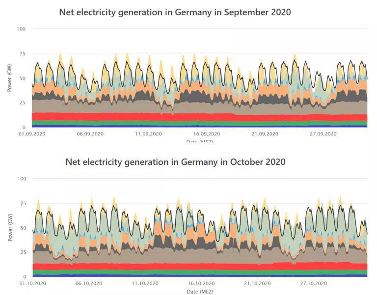 黑色曲線(xiàn)代表一個(gè)月內(nèi)的負(fù)荷曲線(xiàn),不同顏色的色塊代表不同的發(fā)電源,由上至下:淺黃色為太陽(yáng)能發(fā)電,淺綠色為海上風(fēng)電與陸上風(fēng)電之和,淺藍(lán)色則為抽水蓄能。接下來(lái),橘黃色色塊為天然氣發(fā)電量,深、淺兩種棕色色塊則代表無(wú)煙煤與褐煤發(fā)電量之和。最底部構(gòu)成基礎(chǔ)負(fù)荷的則分別為核能(紅色),生物質(zhì)能(深綠色),及水力發(fā)電(深藍(lán)色)。下同。所有負(fù)荷曲線(xiàn)圖均來(lái)自Fraunhofer ISE研究所的Energy-Charts平臺(tái)。