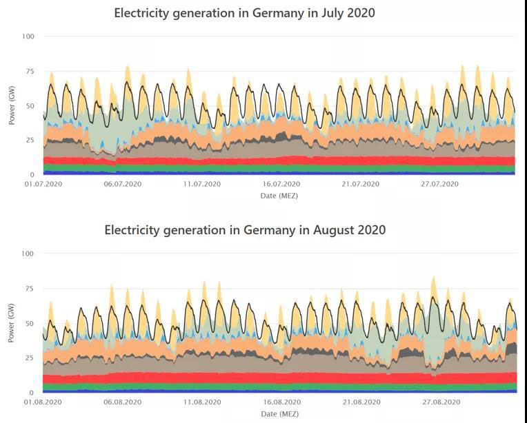 七、八月德國(guó)的光照資源仍十分優(yōu)越,由于總負(fù)荷還沒(méi)有回到正常范圍,許多天可再生能源與化石燃料發(fā)電量之和都超過(guò)了德國(guó)的總負(fù)荷量,得益于多年來(lái)發(fā)展的較好跨國(guó)電力通道建設(shè),多余的電力通過(guò)跨國(guó)輸電網(wǎng)出口至其他歐洲國(guó)家, 共同消納。