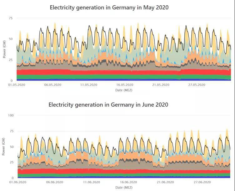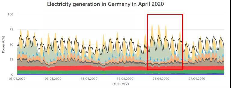 四月的負(fù)荷曲線(xiàn)中可以看出新冠流行的封鎖對(duì)總負(fù)荷量的影響更大了,整個(gè)負(fù)荷曲線(xiàn)向下移動(dòng)了約10GW。光伏發(fā)電在四月總發(fā)電量中占比非常高,4月22日下午13:00,光伏設(shè)備共發(fā)電37.01GW,所有可再生能源發(fā)電占總負(fù)荷量約為84.6%。