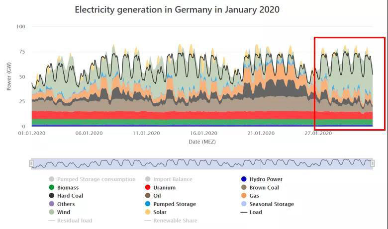 德國(guó)國(guó)家緯度較高,一月的光照資源較少,但風(fēng)力資源相對(duì)較優(yōu)。一月的最后三天風(fēng)電發(fā)電量有力支撐了超過(guò)七成的負(fù)荷側(cè)電量消費(fèi)。尤其注意1月31日,當(dāng)天可再生資源最高生產(chǎn)了占總用電負(fù)荷76.8%的電量。