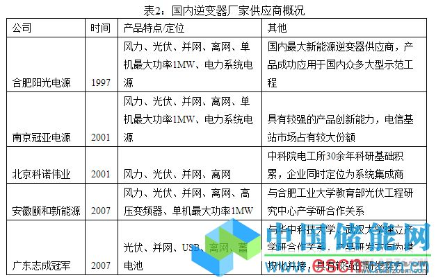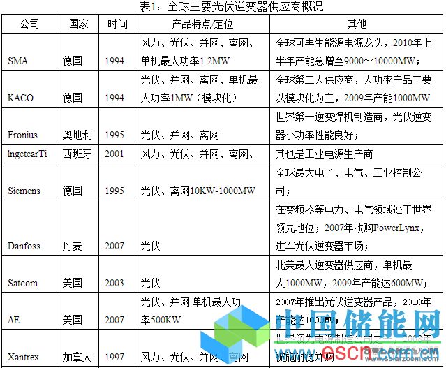 美國、日本也具有雄厚的工業(yè)基礎(chǔ)和先進(jìn)的半導(dǎo)體技術(shù),他們?cè)陔娐方Y(jié)構(gòu)設(shè)計(jì)、電氣和自動(dòng)控制設(shè)計(jì)方面具有很強(qiáng)的實(shí)力,所以他們依靠公司的品牌在光伏逆變器生產(chǎn)設(shè)計(jì)方面也具有很強(qiáng)的實(shí)力和競爭優(yōu)勢。國外主要逆變器廠商有:SMA、KACO、Fronius、lngetearTi、Siemens、studer、xantrex、Danfoss、conergy、Power-one、OutbackPower、AE,Spwtick等公司,其中SMA、KACO、Fronius、lngeteam、Siemens占全球市場份額70%,逆變器的先行者德國SMA2009年市場占有率為44%,銷售額9.3億歐元,逆變器出貨量達(dá)3.4GW,2010年銷售額達(dá)到11億~l3億歐元,同比增長18%~40%。傳統(tǒng)光伏逆變器廠商紛紛擴(kuò)充產(chǎn)能,建設(shè)完善渠道,同時(shí)傳統(tǒng)電氣、自控等工業(yè)巨頭也加速進(jìn)入新能源逆變器市場。(注:表1和表2中的“時(shí)間”均指企業(yè)的成立時(shí)間)