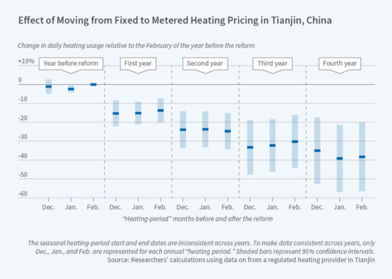 美國(guó)哈里斯公共政策研究所伊藤光一郎、科羅拉多大學(xué)博爾德分校的張爽(音譯)的研究發(fā)現(xiàn),如何對(duì)居民用能收費(fèi)會(huì)對(duì)社區(qū)的能源使用產(chǎn)生重大影響,并最終影響到空氣質(zhì)量。以中國(guó)天津?yàn)槔?,有關(guān)部門用以熱計(jì)量為基礎(chǔ)的系統(tǒng)取代了固定價(jià)格的供暖收費(fèi)系統(tǒng)。數(shù)據(jù)表明,安裝熱計(jì)量表四年后,供暖能耗下降了約三分之一。