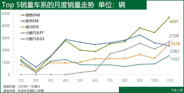 說到單車,2020年賣的最好的那就是理想ONE了,這也是理想汽車的獨(dú)苗苗。理想ONE在2020年的單月銷量連續(xù)攀升,到11月已經(jīng)達(dá)到4691輛,12月份上險(xiǎn)銷量尚未可知,但理想汽車公布的交付數(shù)據(jù)是6126輛。自2020年9月,理想ONE的銷量就超越了蔚來ES6,稱霸新勢(shì)力車系榜。