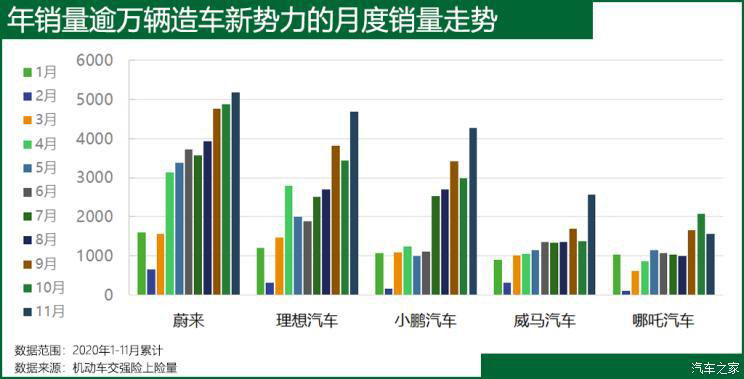 威馬汽車和哪吒汽車的年銷量超過了萬輛,分別達(dá)到14084輛和12156輛。而哪吒汽車后面的,就是月銷量為三位數(shù)甚至兩位數(shù)、個(gè)位數(shù)的新勢(shì)力們了。所以,如果以10000輛為基準(zhǔn),2020年有5家新勢(shì)力過了這一門檻,“理蔚鵬”加上威馬和哪吒,被稱為新勢(shì)力“五強(qiáng)”,“五強(qiáng)”算是新勢(shì)力中跑出來了的,但后市壓力依然山大。