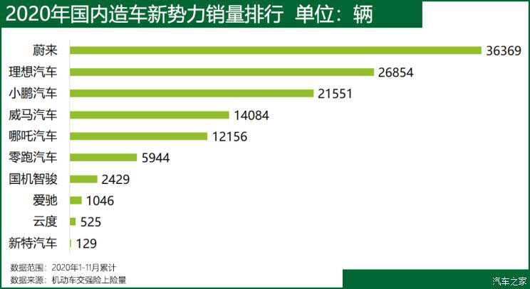 從年度總銷量看,蔚來無疑是目前成績(jī)最好的。據(jù)最新數(shù)據(jù),2020年前十一個(gè)月蔚來汽車?yán)塾?jì)實(shí)現(xiàn)銷量36369輛,排在新勢(shì)力之首。而據(jù)蔚來自己公布的數(shù)據(jù),2020年全年蔚來累計(jì)交付了43728輛車,12月的單月銷量是7007輛。理想汽車的總銷量排在第二,前十一個(gè)月累計(jì)銷量26854輛,理想汽車也是首個(gè)將上險(xiǎn)銷量作為銷量數(shù)據(jù)公布的車企,各種深意不解自明。小鵬汽車的銷量也超過了兩萬輛,以累計(jì)21551輛的銷量排在了新勢(shì)力榜單第三名。