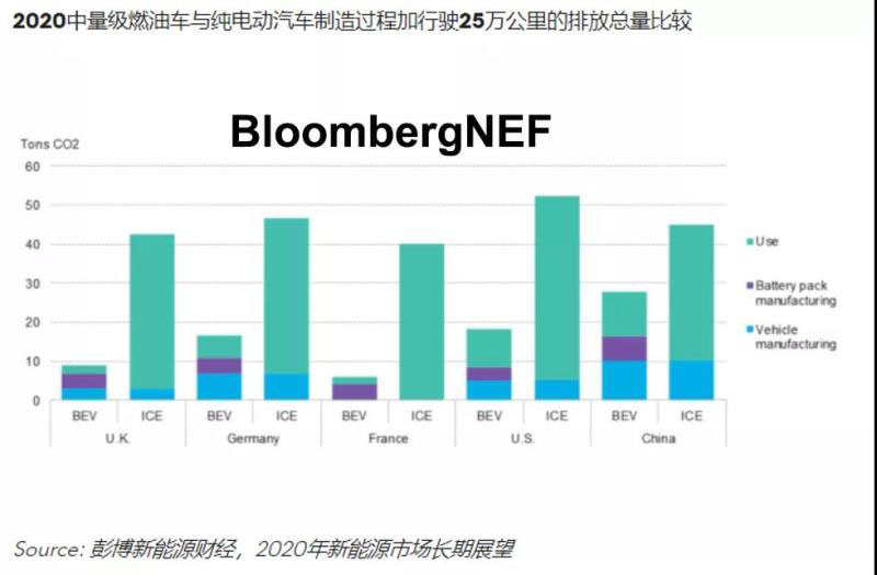 中國儲能網(wǎng)訊:新能源汽車行駛時無尾氣排放,但在制造和行駛過程中仍有相關(guān)排放。部分國家的監(jiān)管機(jī)構(gòu)考慮對純電動汽車(BEV)和燃油車(ICE)全生命周期內(nèi)二氧化碳排放的可能性。本報告中,BNEF提出了到2040年美國、中國、英國、德國和法國的新能源汽車和燃油車使用過程和全生命周期排放量的估算。