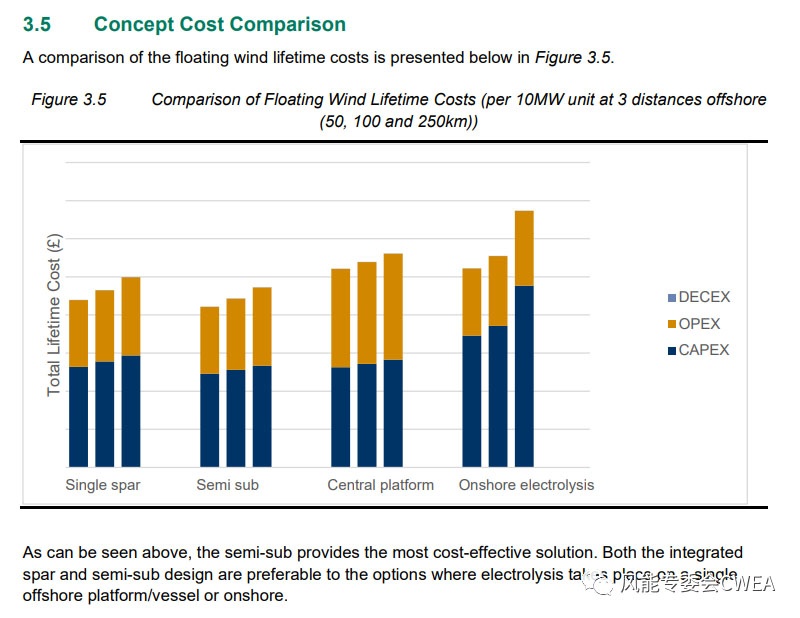 其中兩臺(tái)自帶電解槽的漂浮式風(fēng)機(jī),使用不同的漂浮式基礎(chǔ),一個(gè)是單柱式漂浮式海上基礎(chǔ),一個(gè)采用半潛式漂浮式基礎(chǔ)。第三個(gè)方案使用海上中央平臺(tái)制氫,第四個(gè)只是簡(jiǎn)單地將電力輸送到岸上電解槽制氫。