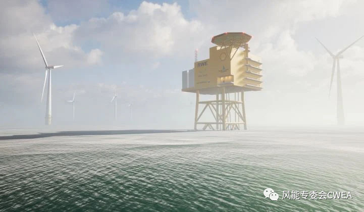 AquaVentus項(xiàng)目渲染圖。預(yù)計(jì)到2035年將有10GW的綠氫在海上生產(chǎn)后再輸送到陸上。(圖片來(lái)源:RWE)